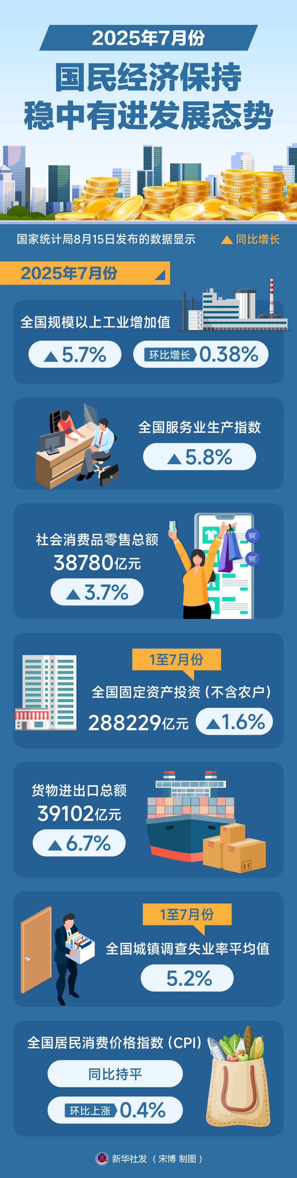 國(guó)家統(tǒng)計(jì)局8月15日發(fā)布的數(shù)據(jù)顯示,2025年7月份,國(guó)民經(jīng)濟(jì)保持穩(wěn)中有進(jìn)發(fā)展態(tài)勢(shì),生產(chǎn)需求持續(xù)增長(zhǎng),就業(yè)物價(jià)總體穩(wěn)定,新質(zhì)生產(chǎn)力培育壯大,高質(zhì)量發(fā)展取得新成效。