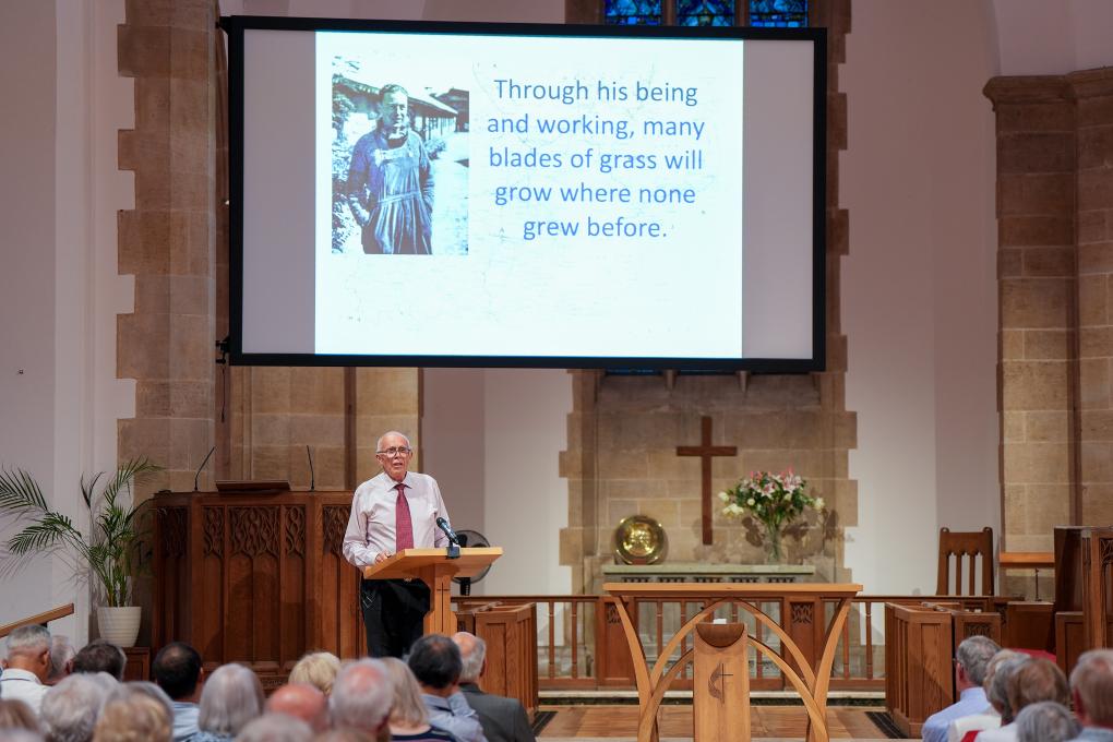 7月22日晚,英國(guó)赫特福德郡哈彭登鎮(zhèn),何克逝世80周年紀(jì)念活動(dòng)現(xiàn)場(chǎng),座無(wú)虛席。屏幕上,一幀幀畫面定格下何克在中國(guó)的身影與足跡。講臺(tái)上,何克的外甥馬克·艾爾溫·托馬斯深情講述80多年前的往事。