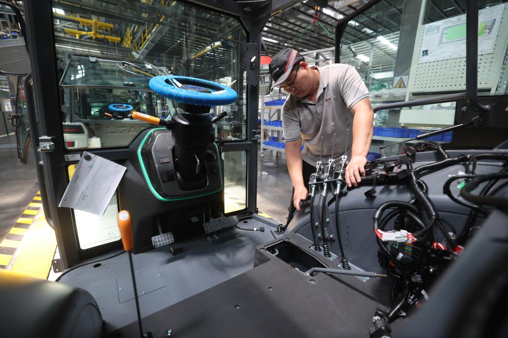 7月27日,工人在山東省臨沂市蘭山區(qū)臨工智慧農機裝備產業(yè)園的流水線上組裝拖拉機。新華社發(fā)(王彥冰攝)