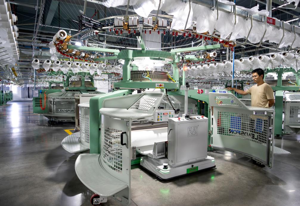 7月24日,一名工人在泉州聯(lián)興發(fā)針織織造有限公司的萊卡+5G智能數字化生產車間操控機器人工作。新華社記者 魏培全 攝