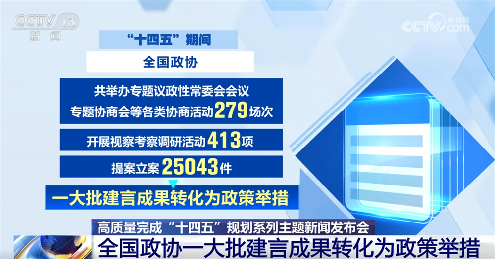 “十四五”期間,全國(guó)政協(xié)共舉辦專(zhuān)題議政性常委會(huì)會(huì)議、專(zhuān)題協(xié)商會(huì)等各類(lèi)協(xié)商活動(dòng)279場(chǎng)次,開(kāi)展視察考察調(diào)研活動(dòng)413項(xiàng),提案立案25043件,一大批建言成果轉(zhuǎn)化為政策舉措。