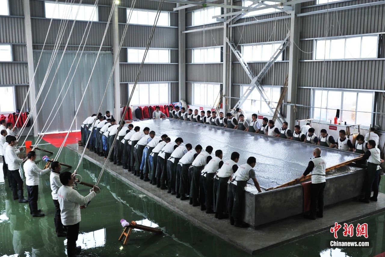 “三丈三”宣紙撈制現(xiàn)場(chǎng)。尹建生 攝