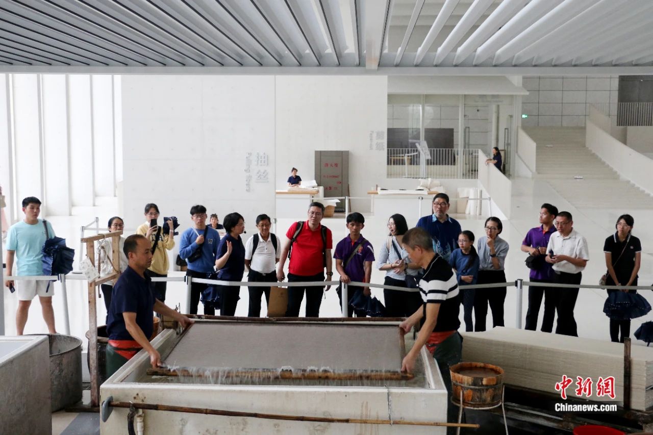 馬來(lái)西亞游客在中國(guó)宣紙小鎮(zhèn)參觀宣紙撈紙技藝。張強(qiáng) 攝