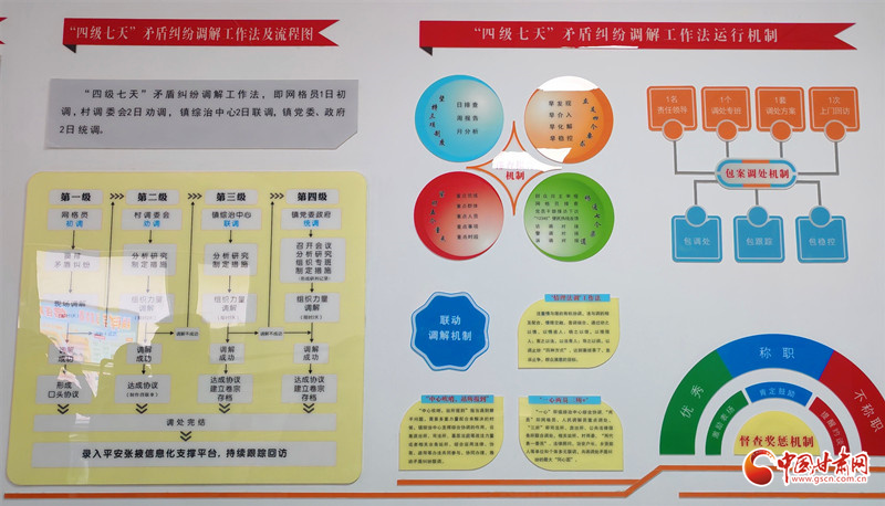 網格員初調:手持終端“一鍵上報”,1天內就地化解;村調委會勸調:鄉(xiāng)賢、“三官一師”齊上陣,2天內情理交融;鎮(zhèn)綜治中心聯調:“中心吹哨、部門報到”,2天內集中“會診”;鎮(zhèn)黨委政府統(tǒng)調:專班下沉、縣直聯動,2天內“案結事了”。