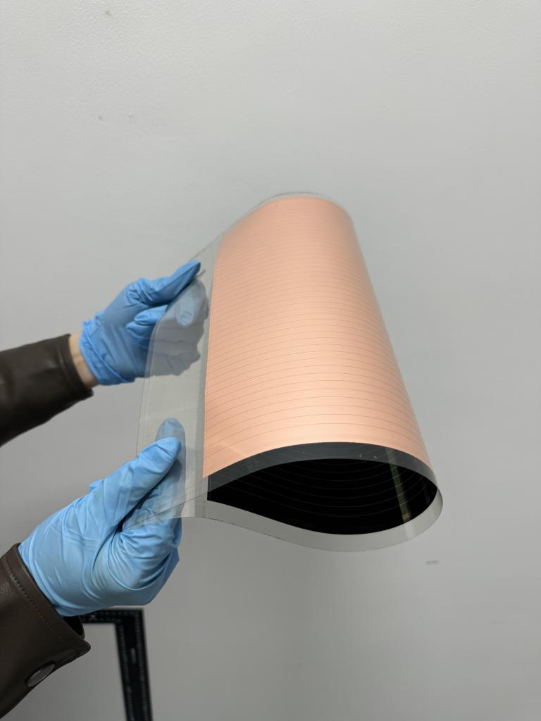 今年,校企聯(lián)合團(tuán)隊(duì)成功將原位涂層技術(shù)轉(zhuǎn)移到工業(yè)級(jí)狹縫涂布設(shè)備上,實(shí)現(xiàn)寬帶隙鈣鈦礦薄膜在800多平方厘米的柔性基板上一次成型。