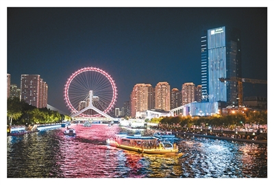 游船搭載游客駛過天津海河三岔河口。新華社記者 孫凡越攝