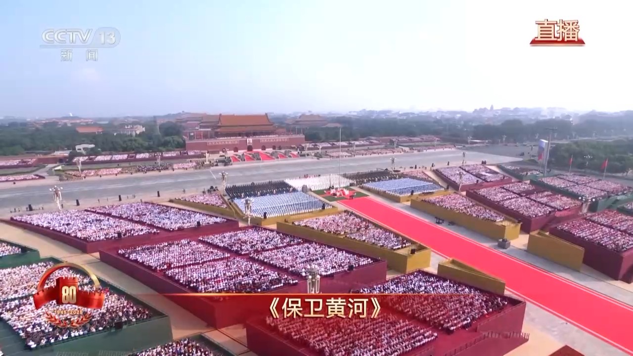 紀(jì)念大會(huì)開(kāi)始前,天安門(mén)廣場(chǎng)上千人軍樂(lè)團(tuán)、合唱團(tuán)奏唱抗戰(zhàn)歌曲《保衛(wèi)黃河》。