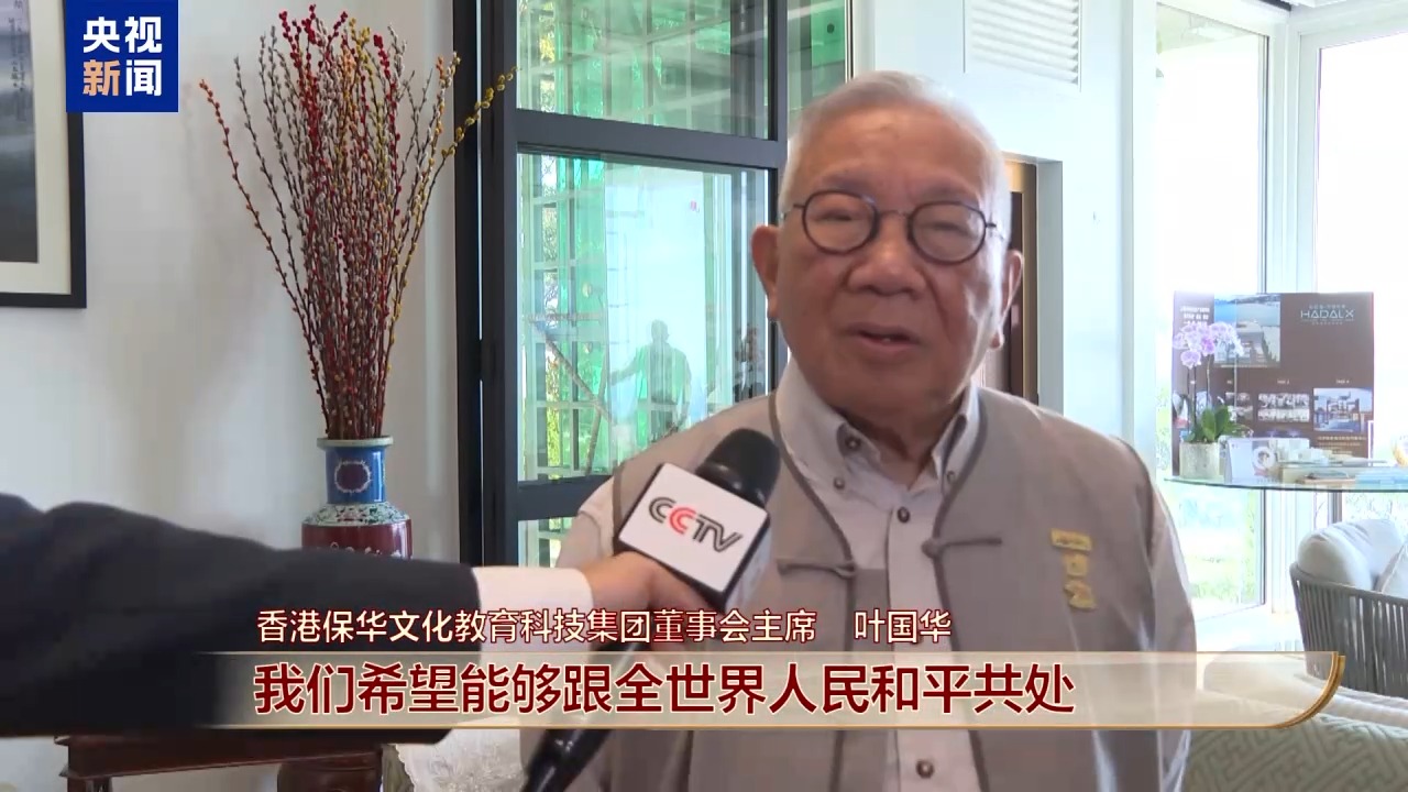 香港保華文化教育科技集團(tuán)董事會主席 葉國華:我一般看電視都坐著。今天我不是坐著而是站著。因?yàn)槲矣米钭鹁吹男膩砜?。?xí)近平主席講話精神是,我們希望能夠跟全世界人民和平共處,能夠以構(gòu)建人類命運(yùn)共同體來帶動全球。