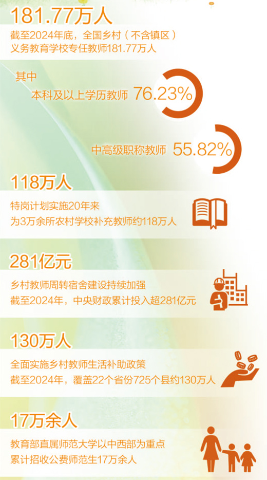 這是真金白銀的投入。2024年,特崗教師工資性補助再次提標,每人每年增加3600元;鄉(xiāng)村教師生活補助政策深入實施,受益教師約130萬人,人均月補助金額約400元;鄉(xiāng)村教師周轉(zhuǎn)宿舍建設持續(xù)加強,中央財政累計投入超281億元,建設約63.7萬套。