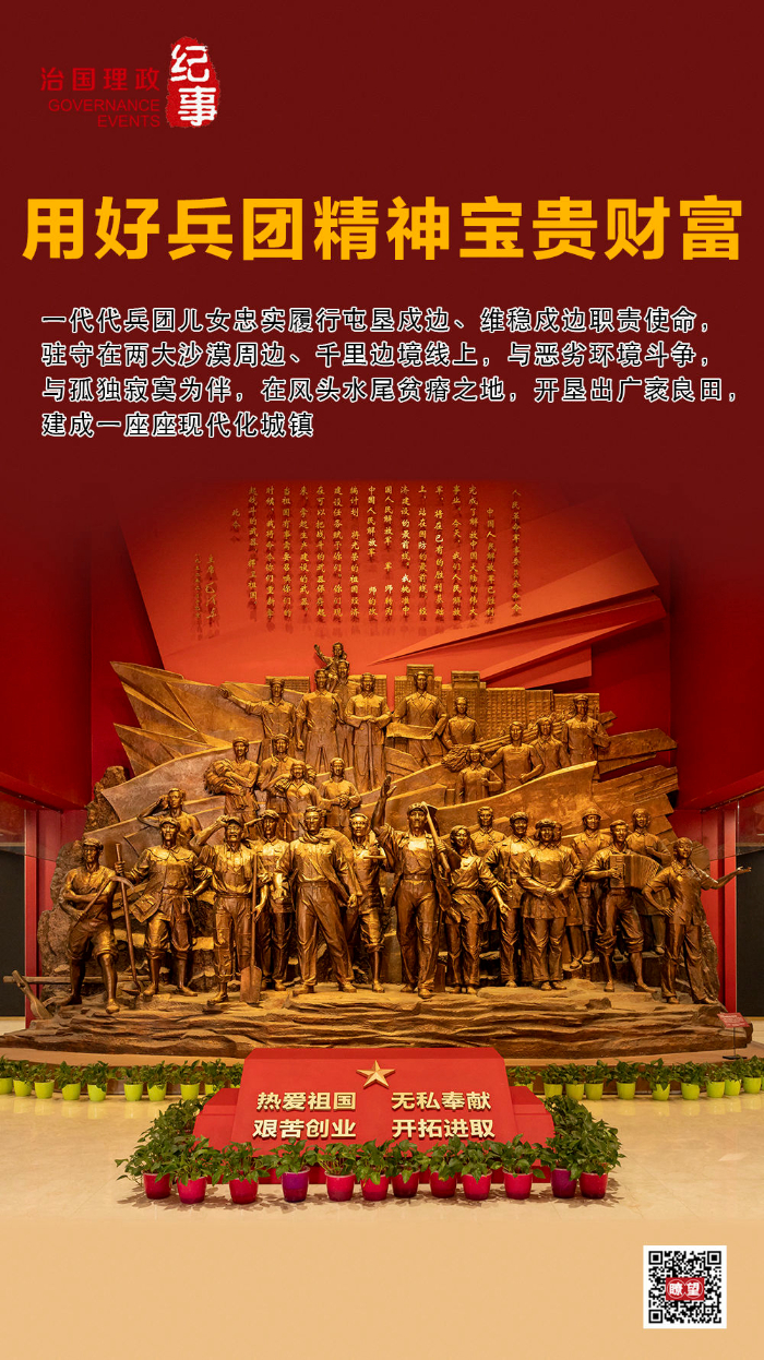 2022年7月,習(xí)近平總書記在新疆考察時(shí)來到新疆生產(chǎn)建設(shè)兵團(tuán)八師石河子市,參觀新疆兵團(tuán)軍墾博物館。會(huì)見兵團(tuán)老中青三代建設(shè)者代表時(shí),他強(qiáng)調(diào),新疆生產(chǎn)建設(shè)兵團(tuán)為推動(dòng)新疆發(fā)展、增進(jìn)民族團(tuán)結(jié)、維護(hù)社會(huì)穩(wěn)定、鞏固國(guó)家邊防作出了不可磨滅的貢獻(xiàn)。兵團(tuán)人鑄就的熱愛祖國(guó)、無私奉獻(xiàn)、艱苦創(chuàng)業(yè)、開拓進(jìn)取的兵團(tuán)精神,是中國(guó)共產(chǎn)黨人精神譜系的重要組成部分,要用好這些寶貴財(cái)富。