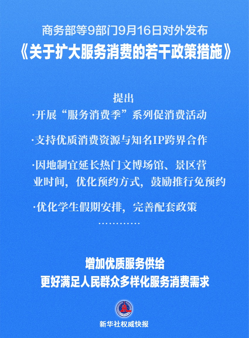 商務(wù)部等9部門16日對外發(fā)布《關(guān)于擴(kuò)大服務(wù)消費(fèi)的若干政策措施》,提出五方面19條舉措進(jìn)一步擴(kuò)大服務(wù)消費(fèi)。