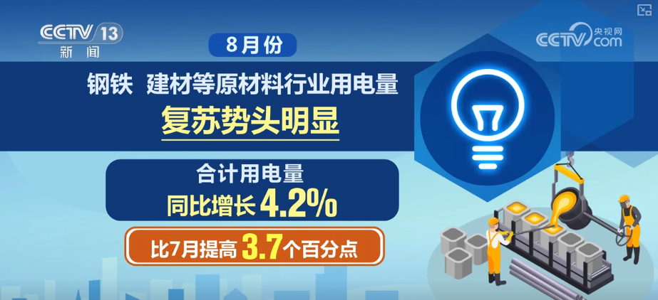 除了制造業(yè),8月份,鋼鐵、建材等原材料行業(yè)用電量復(fù)蘇勢(shì)頭明顯,合計(jì)用電量同比增長(zhǎng)4.2%,比7月提高3.7個(gè)百分點(diǎn)。
