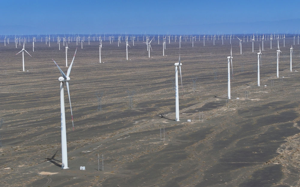 在新疆哈密地區(qū)巴里坤哈薩克自治縣拍攝的三塘湖風(fēng)電場(4月27日攝,無人機(jī)照片)。