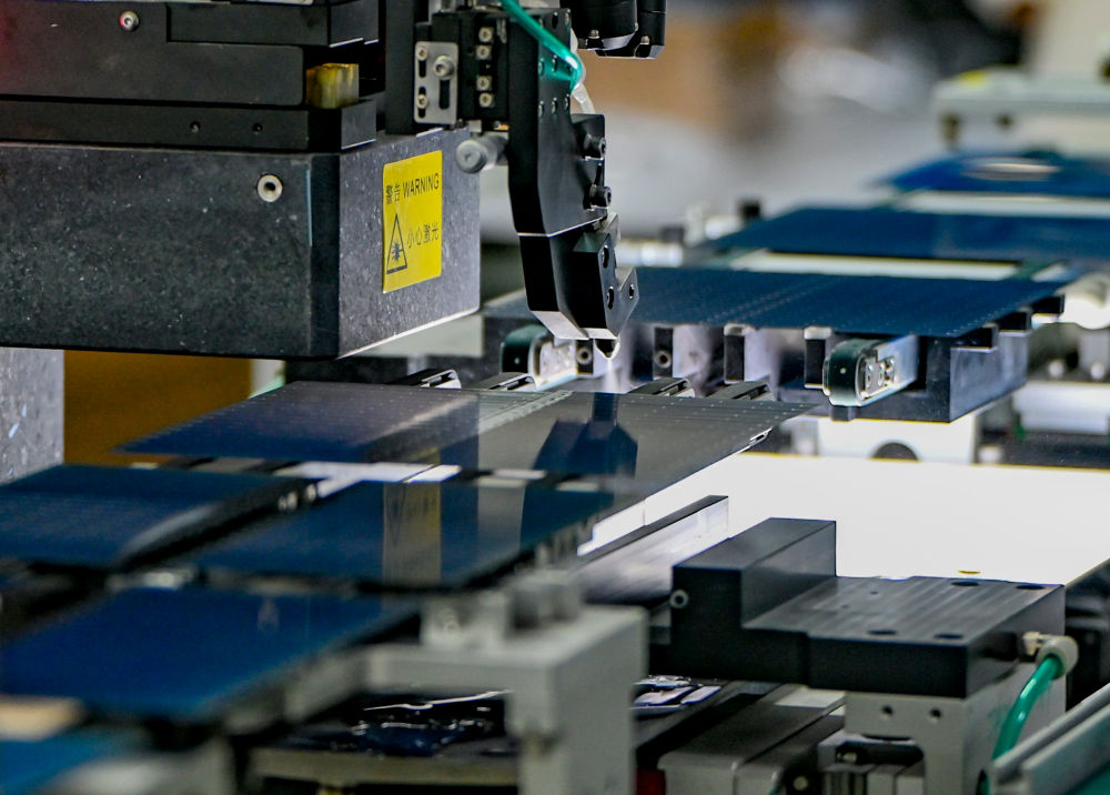 9月22日,在新疆巴音郭楞蒙古自治州若羌縣的國晟企誠新能源有限公司,全自動劃片機(jī)在切割光伏電池片。