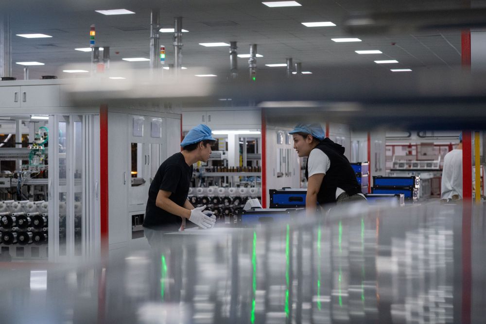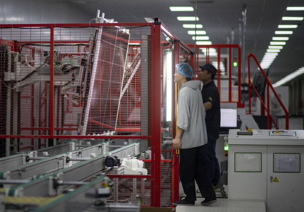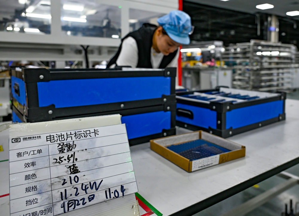 9月22日,工人在新疆巴音郭楞蒙古自治州若羌縣的國晟企誠新能源有限公司生產(chǎn)光伏電池片。