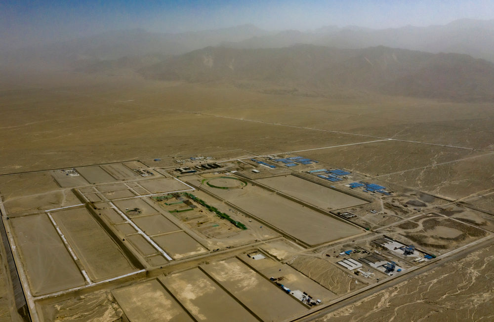 9月22日在新疆巴音郭楞蒙古自治州若羌縣拍攝的三峽集團(tuán)“疆電外送”第四通道電源項(xiàng)目施工現(xiàn)場(無人機(jī)照片)。