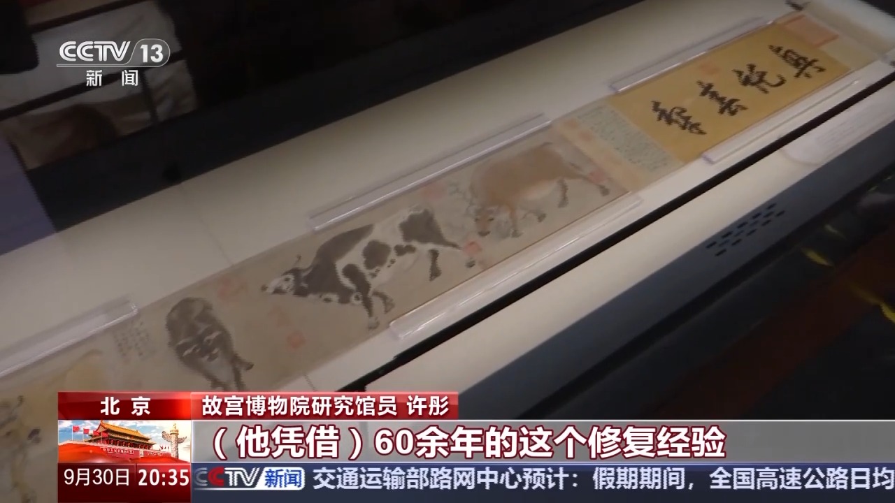 故宮博物院研究館員 許彤:它上面大小破洞應(yīng)該有300多處,非常殘破。后來,修復(fù)專家孫承枝老師憑借其60余年的修復(fù)經(jīng)驗(yàn),通過揭裱、修補(bǔ)、全色又重裝,最終讓國寶重光,獲得新生。