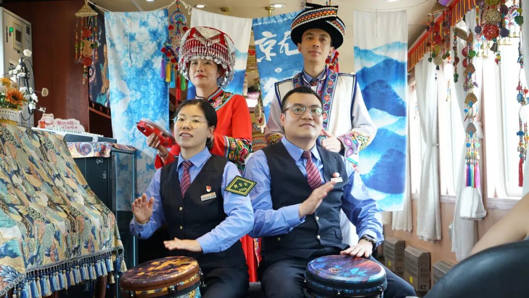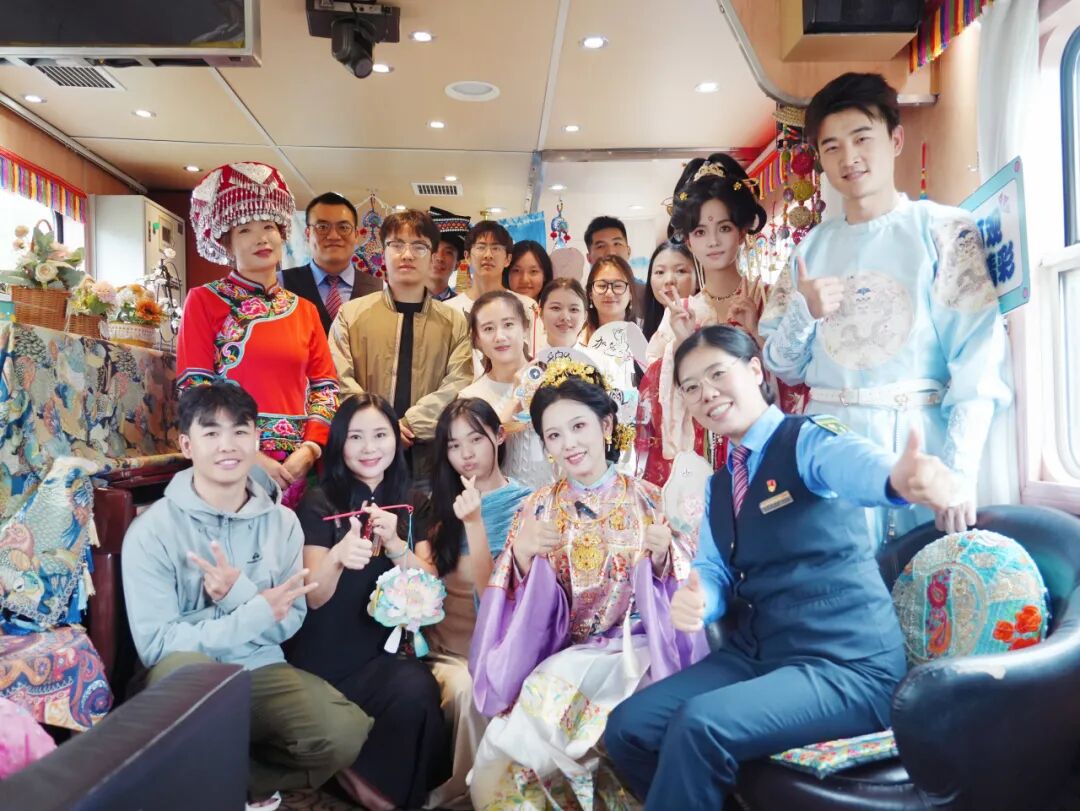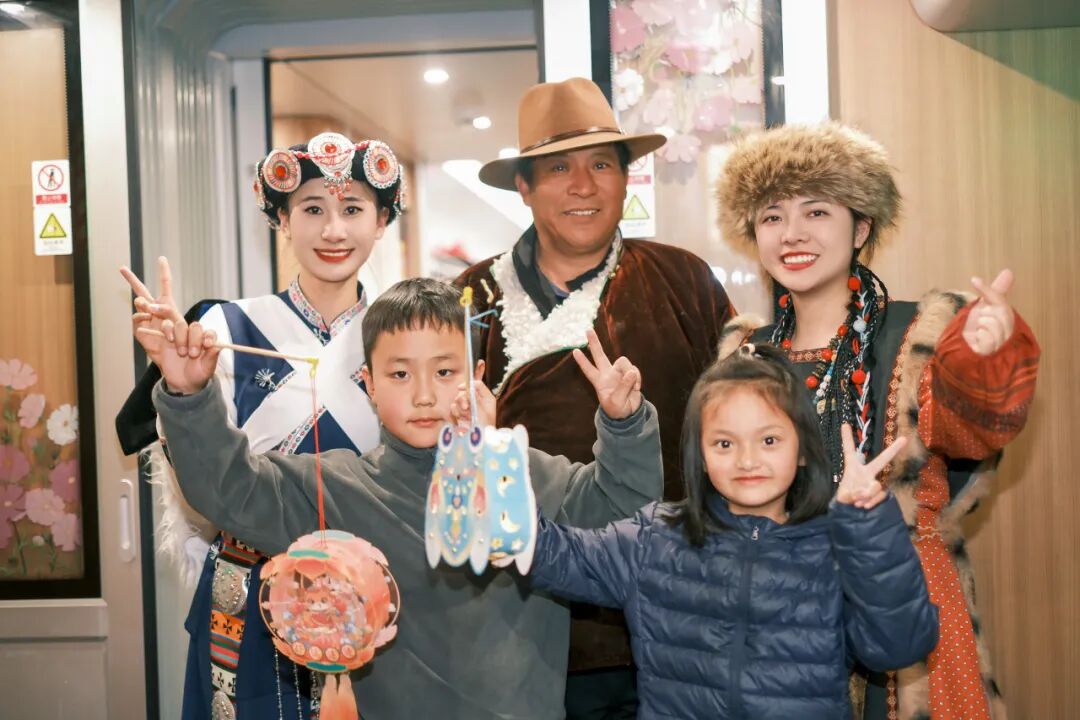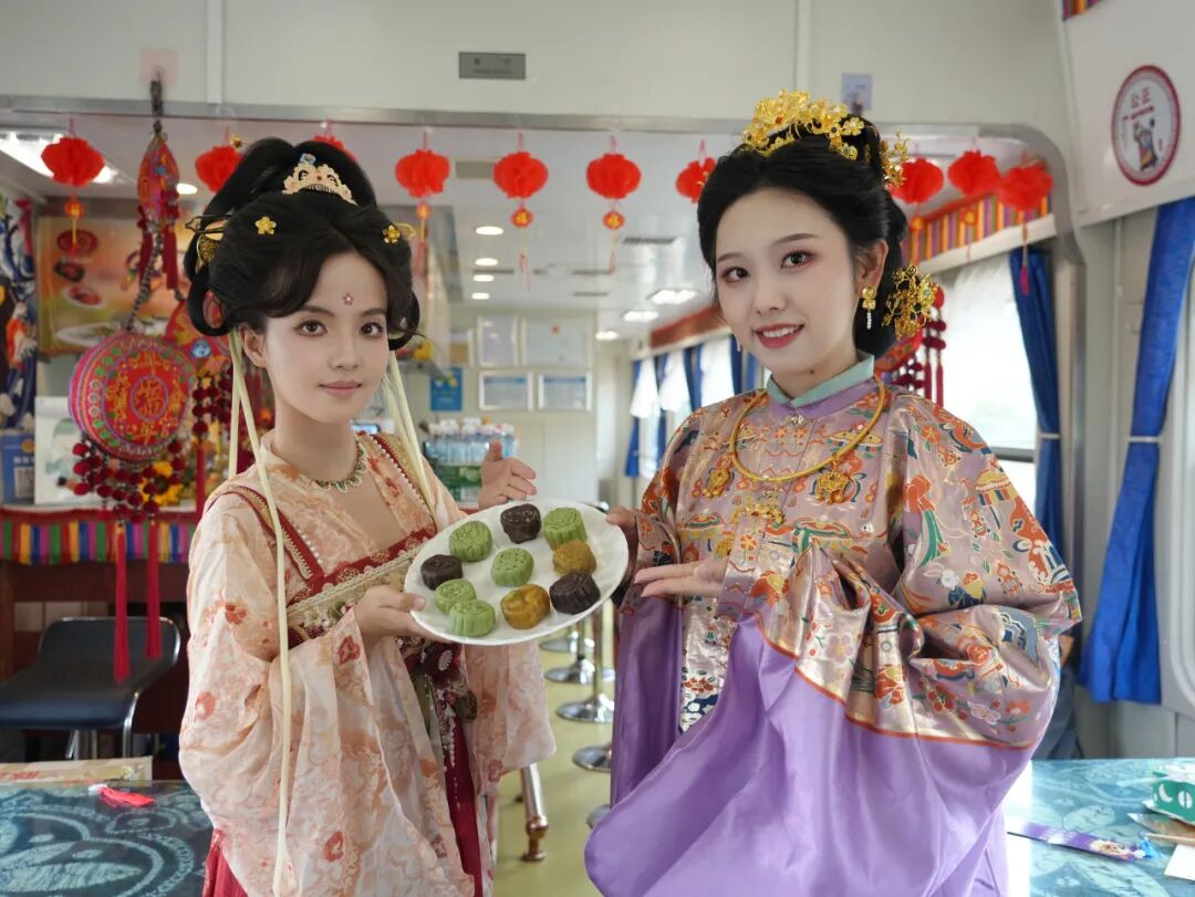 “旅客朋友們,歡迎乘坐本趟列車,中秋佳節(jié)將至,我們在2號(hào)餐車準(zhǔn)備了特色活動(dòng),誠邀大家共慶佳節(jié)!”列車長李文雯的聲音通過廣播傳遍車廂。隨即《納西三部曲》旋律響起——身著絢麗民族服飾的列車員們,拉著周圍旅客一同跳起納西族舞蹈,歡快的節(jié)奏瞬間點(diǎn)燃車廂氣氛。