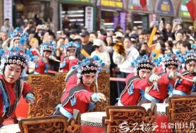 10月1日12時,新疆國際大巴扎步行街化身為一片沸騰的海洋,來自陜西神木的非物質文化遺產代表性項目——“忠勇楊家鼓”在此激情上演,為八方來客獻上一場氣勢磅礴的傳統民俗盛宴。