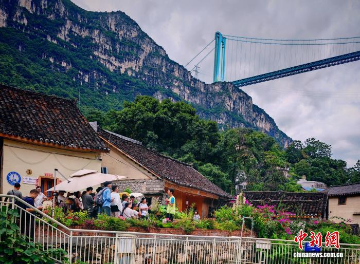 在花江村,記者看到不少游客悠閑地坐在青瓦灰墻的布依族傳統(tǒng)民居前品茶觀橋,或在村口的路邊尋找最佳角度,留下“與大橋同框”的紀(jì)念照;更有游客信步走向村邊的花江鐵索橋,尋找角度拍攝這座曾是黔滇往來(lái)要道的古橋,與遠(yuǎn)處現(xiàn)代工程的杰作形成“新老同框”的獨(dú)特畫面。