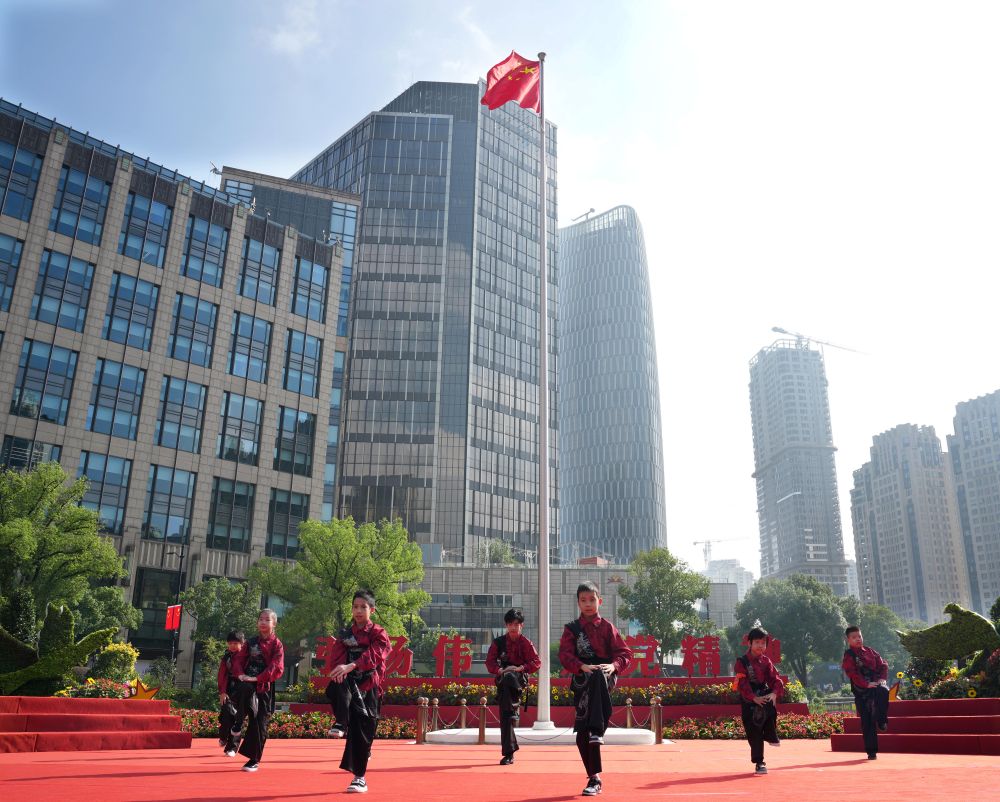 10月1日,在上海中共一大紀念館前舉行的文藝演出中,小朋友在表演舞蹈《男兒當自強》。新華社記者 劉穎 攝