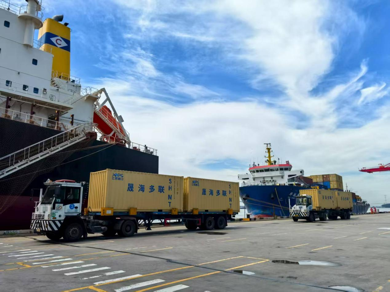 在智慧港口軟硬件升級的同時,物流運輸模式的創(chuàng)新同樣成為“水運江蘇”提質(zhì)增效降本的關鍵引擎。走進龍?zhí)惰F路堆場,只見滿載煤炭的35噸敞頂箱經(jīng)鐵路專列直抵港區(qū),“集改散”吊具精準抓箱,液壓翻轉(zhuǎn)卸煤,煤炭直輸貨輪。同時,滿載集裝箱的“南京-洋山”沿江海鐵班列正整裝待發(fā),即將駛向上海洋山港銜接國際干線班輪。整個鐵水聯(lián)運流程高效銜接,一氣呵成。這正是江蘇港口物流集團晟海公司創(chuàng)新打造的多元化聯(lián)運新格局。