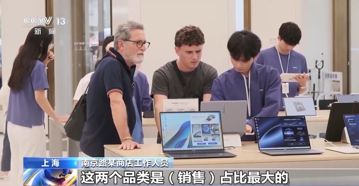 南京路某商店工作人員:外國(guó)顧客特別喜歡音頻類和智能手表類產(chǎn)品,這兩個(gè)品類是銷(xiāo)售占比最大的。