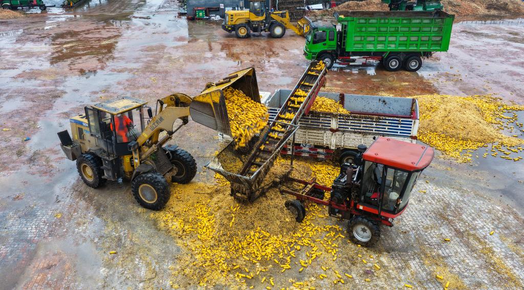 在山東省東營(yíng)市廣饒縣一家糧食收儲(chǔ)企業(yè),工作人員在裝運(yùn)玉米進(jìn)行脫粒(無人機(jī)照片)。(劉云杰 攝)
