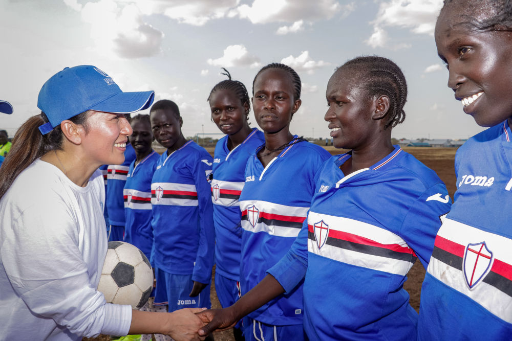 2024年2月21日,聯(lián)合國(guó)難民署親善大使、奧運(yùn)冠軍楊揚(yáng)(左前)與卡庫(kù)馬難民營(yíng)女子足球隊(duì)隊(duì)員交流。新華社發(fā)(聯(lián)合國(guó)難民署供圖)