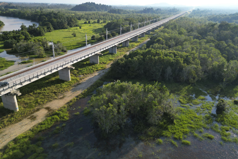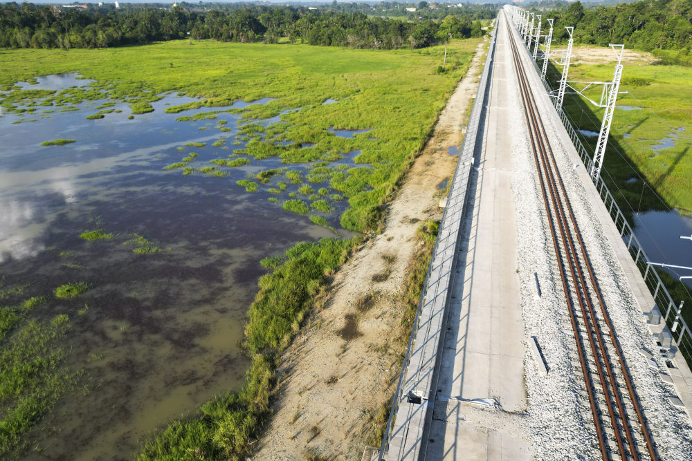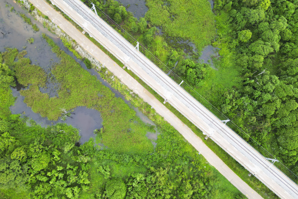 ↑10月9日,在馬來西亞彭亨州,馬東鐵軌道穿越一片濕地(無人機照片)。