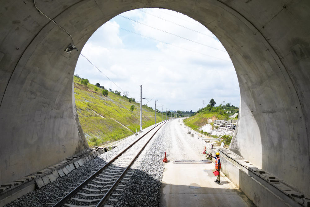 ↑這是10月10日在馬來西亞彭亨州拍攝的馬東鐵項目,從隧道口望出去一片綠意盎然(無人機照片)。