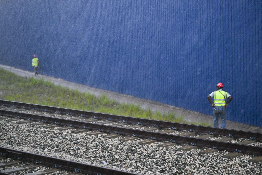 ↑10月9日,在馬來西亞彭亨州,馬東鐵項目工人在雨幕中忙碌。
