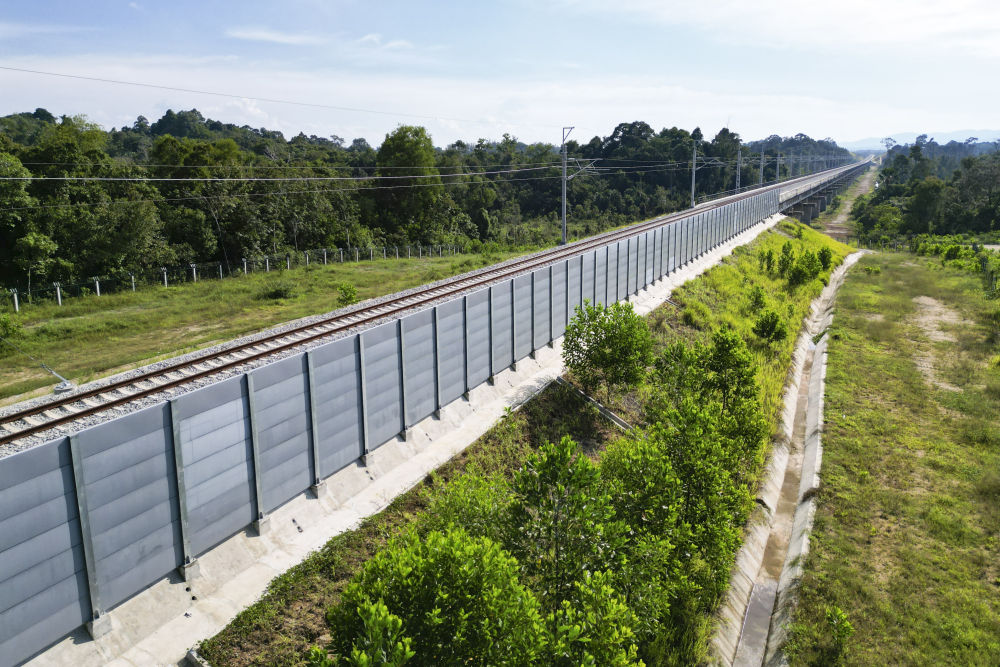 ↑這是10月10日在馬來西亞彭亨州馬東鐵項目拍攝的一處隔音墻,可降低噪音問題對周邊環(huán)境和居民帶來的影響(無人機照片)。