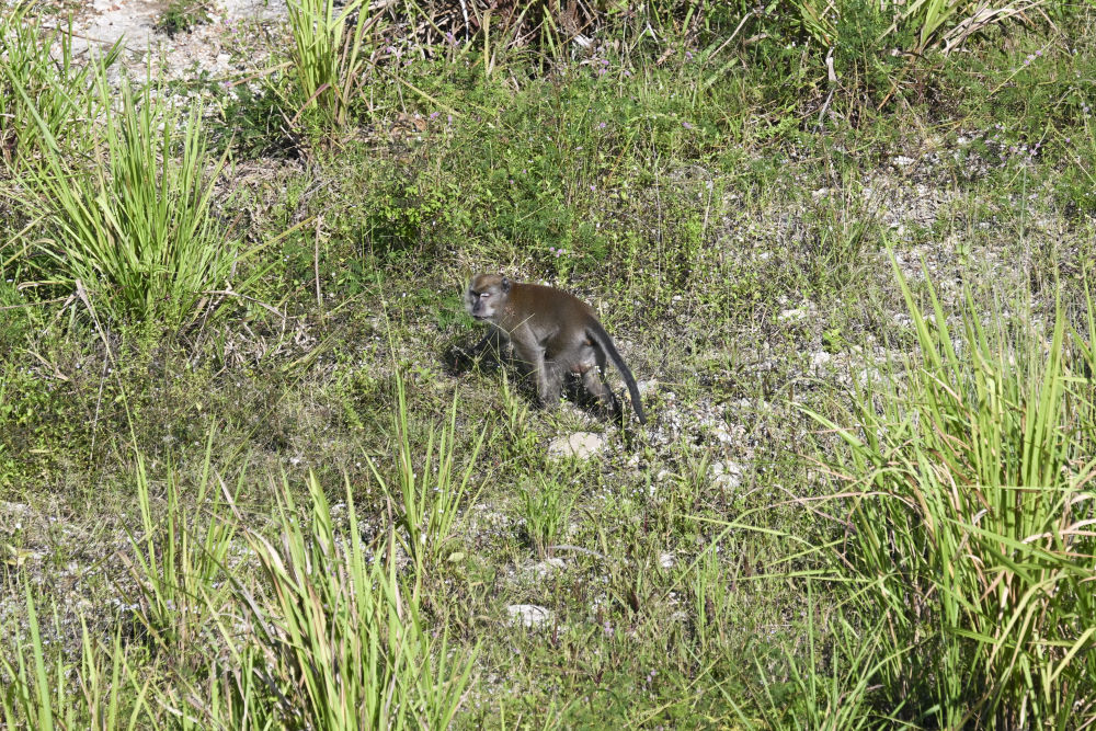 ↑10月10日,在馬來西亞彭亨州,一只猴子從馬東鐵項目的一處橋洞下穿過。