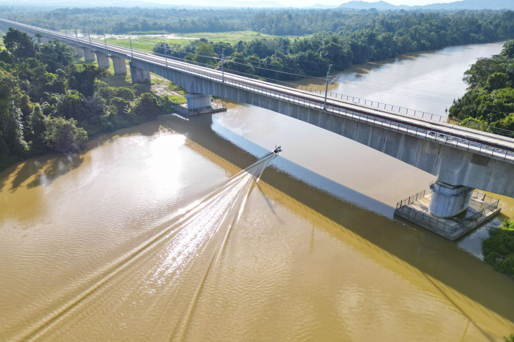 ↑10月10日,在馬來西亞彭亨州,一艘船駛過馬東鐵項目跨關(guān)丹河特大橋(無人機拍攝)。