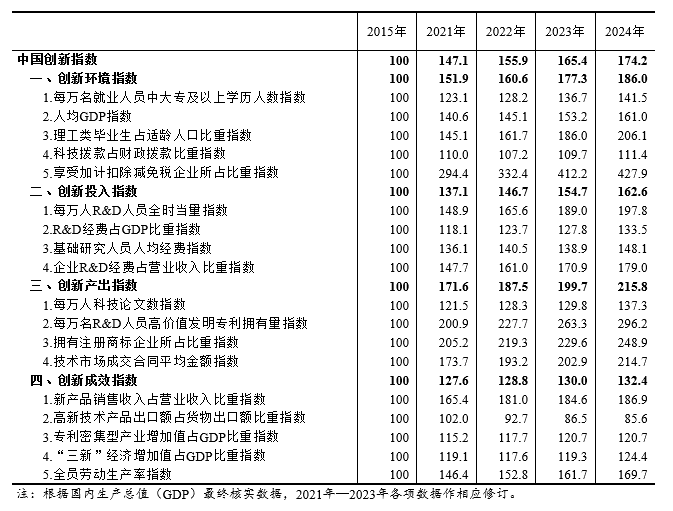 根據(jù)國家統(tǒng)計局社科文司《中國創(chuàng)新指數(shù)研究》課題組測算,2024年中國創(chuàng)新指數(shù)為174.2(以2015年為100),比上年增長5.3%[1]。分領(lǐng)域看,創(chuàng)新環(huán)境指數(shù)、創(chuàng)新投入指數(shù)、創(chuàng)新產(chǎn)出指數(shù)和創(chuàng)新成效指數(shù)分別為186.0、162.6、215.8和132.4,分別比上年增長4.9%、5.1%、8.1%和1.9%。結(jié)果表明,2024年中國創(chuàng)新指數(shù)保持穩(wěn)步增長,我國科技創(chuàng)新能力持續(xù)提升,創(chuàng)新產(chǎn)出較快增長,發(fā)展新動能不斷壯大,為經(jīng)濟高質(zhì)量發(fā)展提供有力支撐。