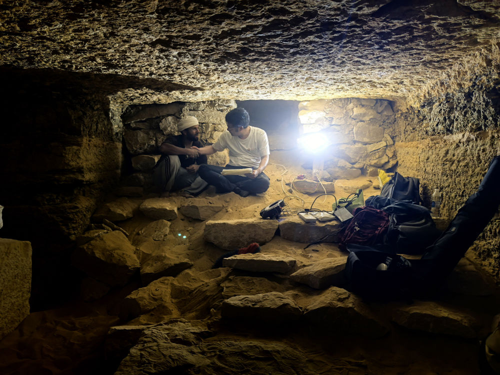 9月16日,在埃及開羅以南的薩卡拉考古遺址區(qū),中埃薩卡拉聯(lián)合考古項目中方領隊薛江(右)和埃方同行在一座貴族墓內工作。(受訪者供圖)