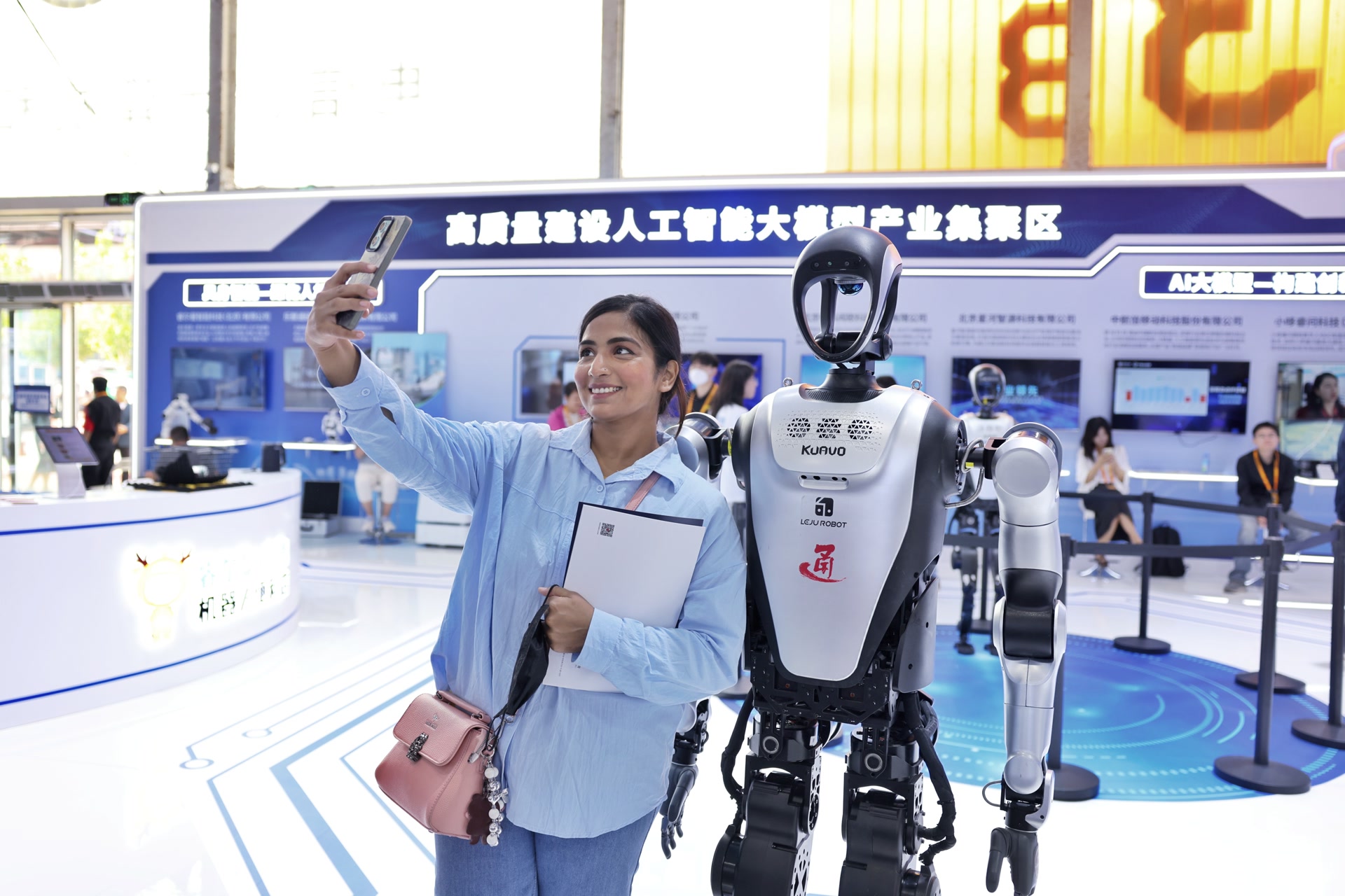 服貿(mào)會上,外國觀眾與機器人合影。 潘之望 攝