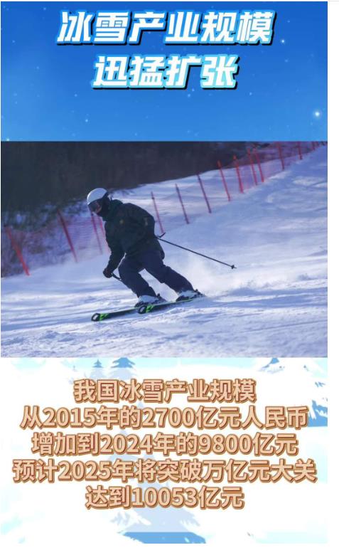 我國(guó)冰雪產(chǎn)業(yè)規(guī)模從2015年的2700億元人民幣增加到2024年的9800億元,預(yù)計(jì)2025年將突破萬(wàn)億元大關(guān),達(dá)到10053億元。