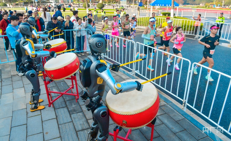 光谷馬拉松現(xiàn)場,人形機(jī)器人為選手加油(央廣網(wǎng)發(fā) 光谷馬拉松組委會供圖)