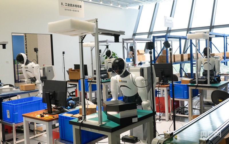 人形機(jī)器人在工業(yè)流水線場景中進(jìn)行動作訓(xùn)練(央廣網(wǎng)記者鄧子依 攝)