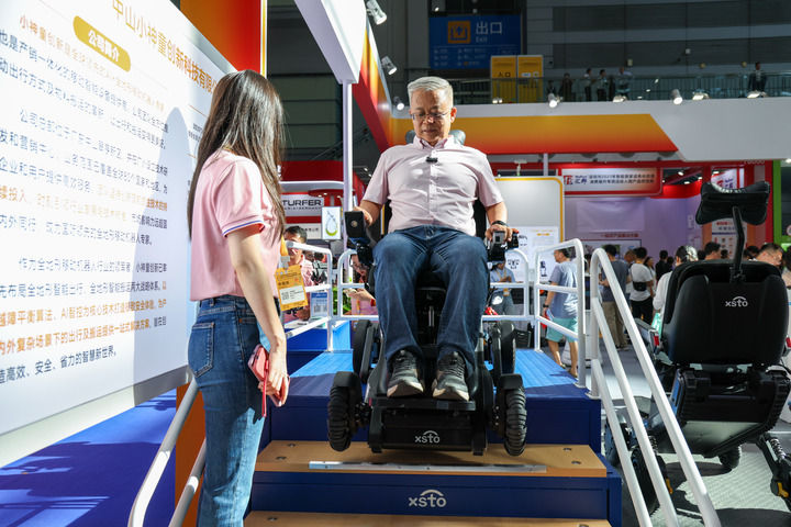 2025年9月12日,在2025深圳國際智慧養(yǎng)老產業(yè)博覽會上,觀眾在展會現(xiàn)場體驗一款可以上下樓梯的智能出行機器人。新華社記者 梁旭 攝