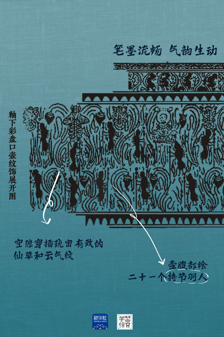 “這件藏于六朝博物館的青瓷釉下彩羽人紋盤口壺于1983年出土,精湛的釉下彩繪工藝,改變了人們對(duì)釉下彩工藝始于唐代的認(rèn)識(shí),把我國(guó)釉下彩繪工藝出現(xiàn)的時(shí)間提前了近五百年?!彼窝嗾f(shuō)。