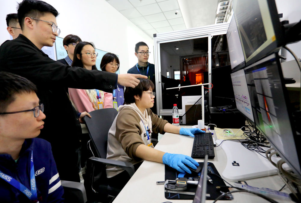 2024年4月10日,安徽省先進(jìn)功能高分子薄膜工程實驗室團(tuán)隊成員朱健和(左)在上海同步輻射光源實驗線站向團(tuán)隊成員講解實驗設(shè)備運行情況。