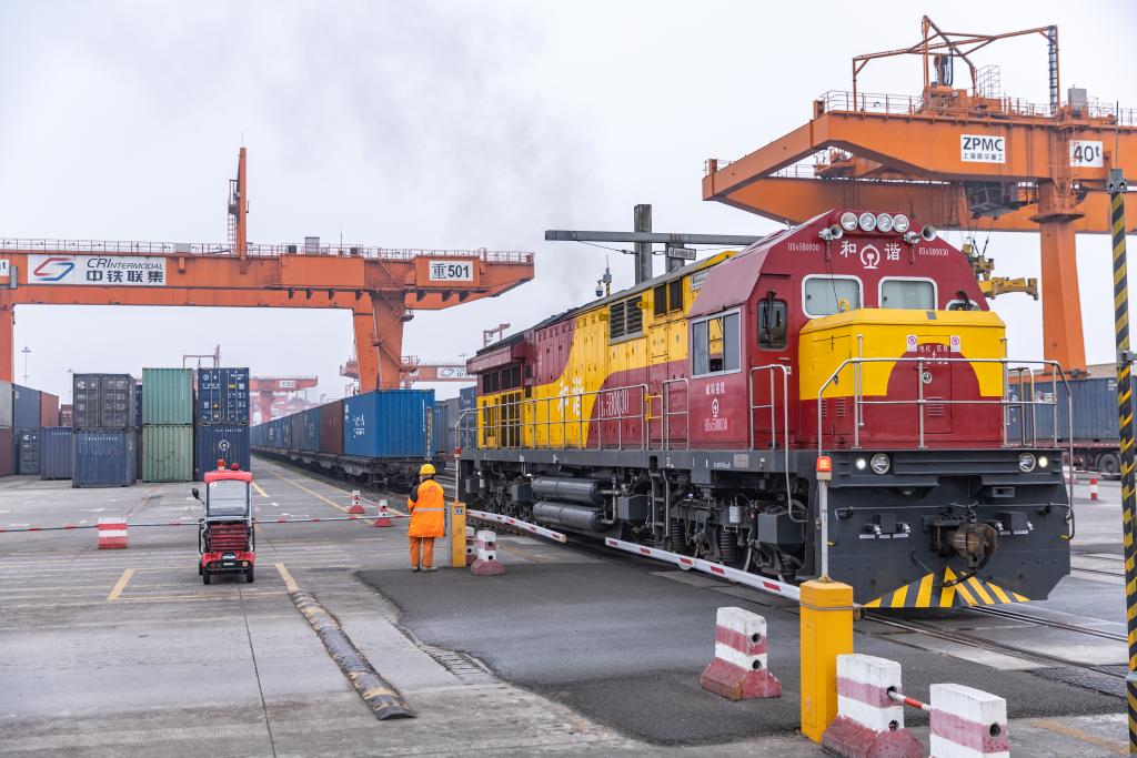 3月7日,一列滿載機械設備、整車及零部件等貨物的中歐班列在重慶團結村中心站等候發(fā)車。 新華社記者 黃偉 攝