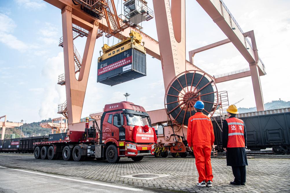 1月4日,在重慶萬州新田港站,工作人員進行集裝箱吊裝作業(yè),將專列貨物轉運至公路物流環(huán)節(jié)。 新華社記者 唐奕 攝