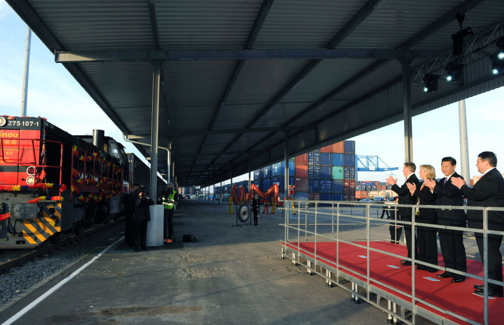2014年3月29日,德國(guó)杜伊斯堡港?!坝逍職W”國(guó)際鐵路聯(lián)運(yùn)大通道的終點(diǎn)。中國(guó)國(guó)家主席習(xí)近平來(lái)到這里。三聲鑼響后,從中國(guó)重慶始發(fā)的列車(chē)滿(mǎn)載著貨物緩緩駛?cè)?。新華社記者 饒愛(ài)民 攝