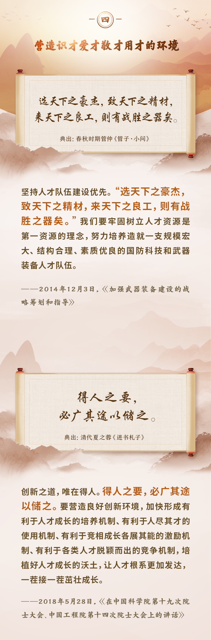 編者按:培養(yǎng)造就大批德才兼?zhèn)涞母咚刭|(zhì)人才,是國(guó)家和民族長(zhǎng)遠(yuǎn)發(fā)展大計(jì)。黨的十八大以來(lái),習(xí)近平總書(shū)記圍繞人才工作發(fā)表一系列重要論述,立意高遠(yuǎn),內(nèi)涵豐富,思想深刻,深刻回答了為什么建設(shè)人才強(qiáng)國(guó)、什么是人才強(qiáng)國(guó)、怎樣建設(shè)人才強(qiáng)國(guó)的重大理論和實(shí)踐問(wèn)題。在這些重要論述中,總書(shū)記精妙運(yùn)用古代典籍、經(jīng)典名句,以古喻今、啟迪思想、激蕩精神,讓我們一起來(lái)學(xué)習(xí)!