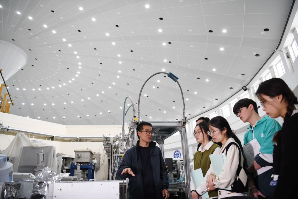 在中國科學(xué)技術(shù)大學(xué)國家同步輻射實驗室,安徽省先進(jìn)功能高分子薄膜工程實驗室團(tuán)隊成員崔昆朋教授(左一)同學(xué)生交流(2024年4月6日攝)。新華社記者 張端 攝