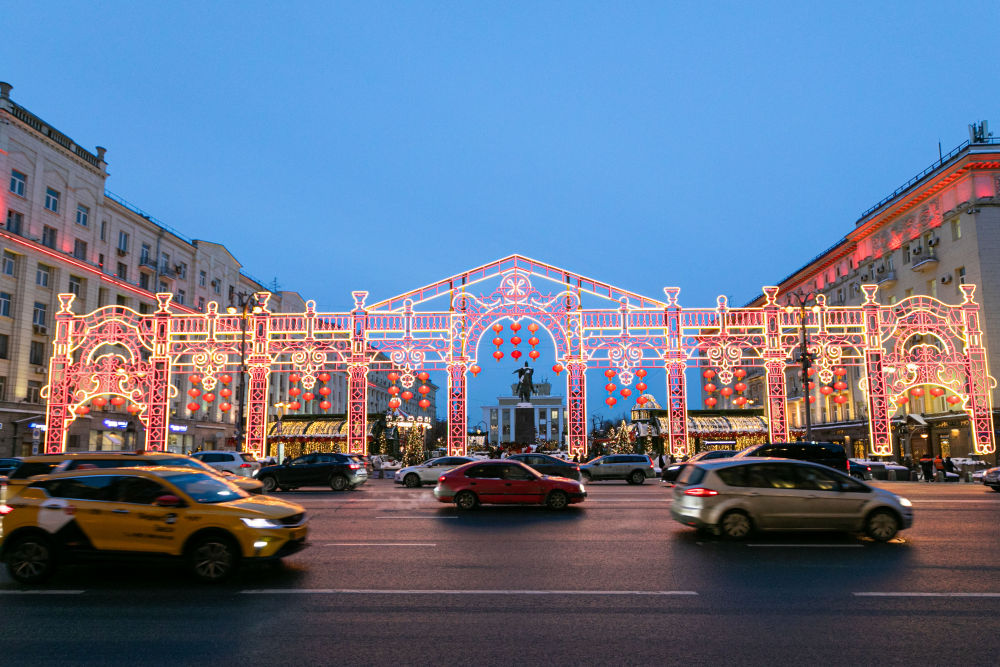 2024年2月9日,在俄羅斯首都莫斯科,車輛在中國新年主題裝飾前駛過。當(dāng)日,“莫斯科的中國新年”文化活動(dòng)在俄羅斯首都莫斯科市中心啟動(dòng)?! ⌒氯A社記者 白雪騏 攝